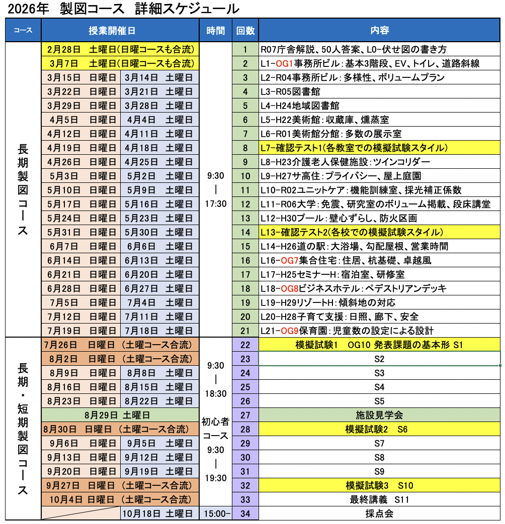 2026年一級建築士『製図コース』 詳細スケジュール